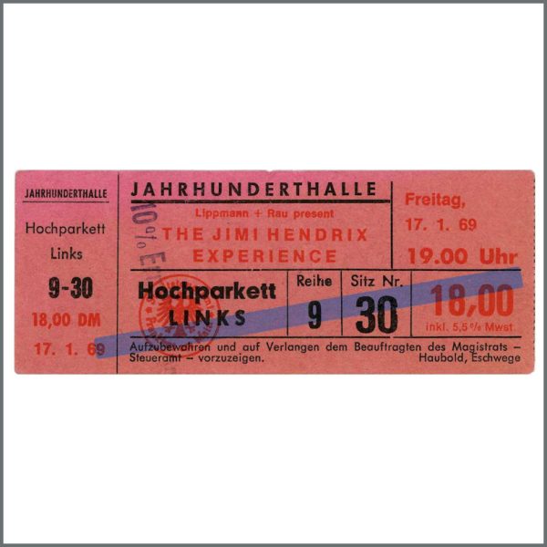An original unused concert ticket for the Jimi Hendrix Experience performance at Jahrhunderthalle, Frankfurt, Germany on 17th January 1970. The ticket measures 10.75cm x 4.25cm (4.25 inches x 1.6 inches). The condition is very good plus.