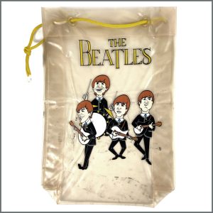 £125.00Add to basketAn original 1964 Beatles Booty Bag. The clear plastic bag features caricature drawings of the group in blue suits and closes with a yellow drawstring. The words ‘Made In Japan’…