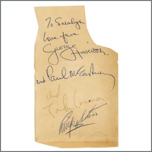 Buy productAn exceptionally rare set of Beatles autographs on a piece of paper in ballpoint pen. Paul McCartney, George Harrison and Ringo Starr have signed in blue ballpoint pen, John Lennon…